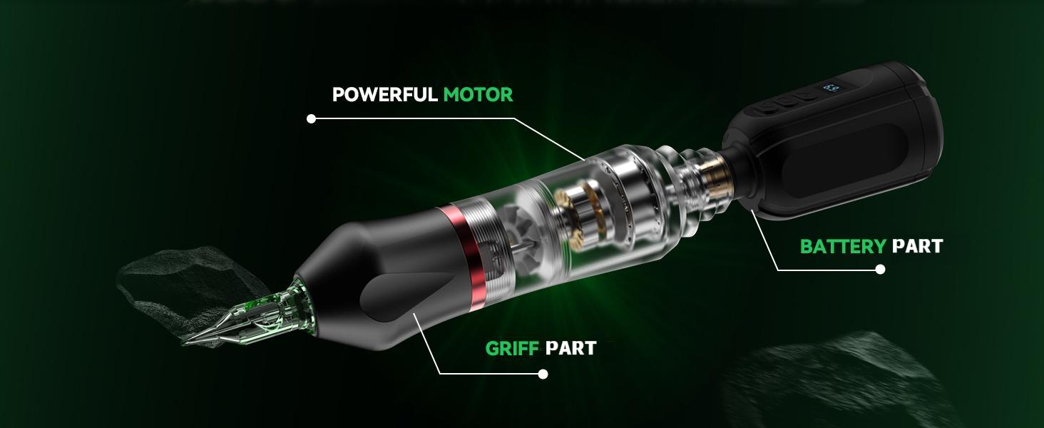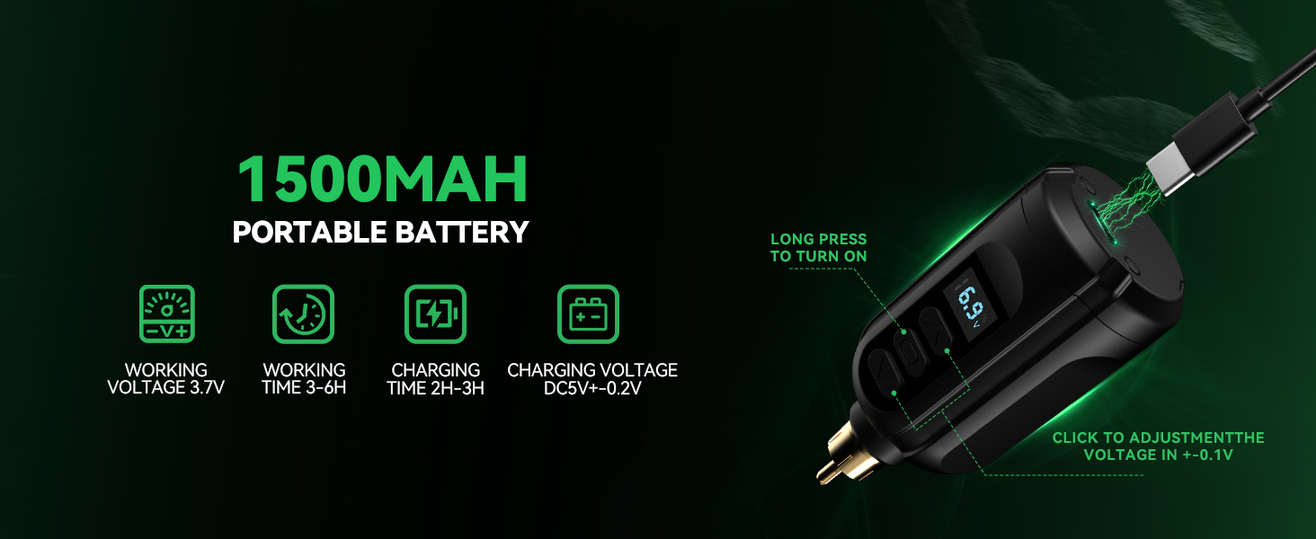 Masina de tatuaje are un acumulator de 1500 mAh, care asigura ore de functionare continua, fara a fi nevoie de cabluri sau prize in timpul lucrului. Designul compact o face usor de transportat si de utilizat in orice locatie.