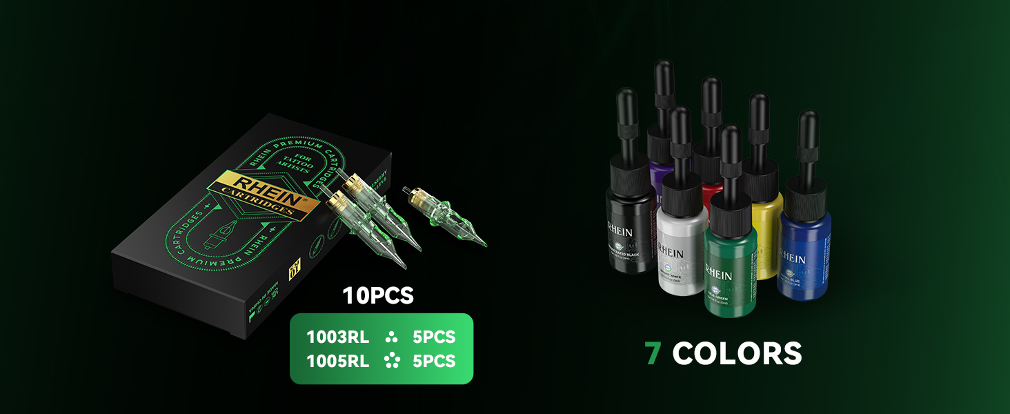 Cele 7 cerneluri incluse permit realizarea de tatuaje variate, cu culori vibrante si rezistente. Culorile sunt ideale pentru contur, umplere si detalii fine.